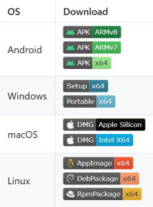 Github页面上有一个按照系统划分的表格,列出了系统对应的安装包。Windows 里有Setup是普通的安装包,Portable是免安装包;Android 下载分为三种架构:ARMv8 适用于大多数新款手机(64 位处理器)、ARMv7 适用于较老的手机(32 位处理器)、x64 主要用于安卓模拟器(如 BlueStacks、雷电模拟器等使用 x86_64 架构)。